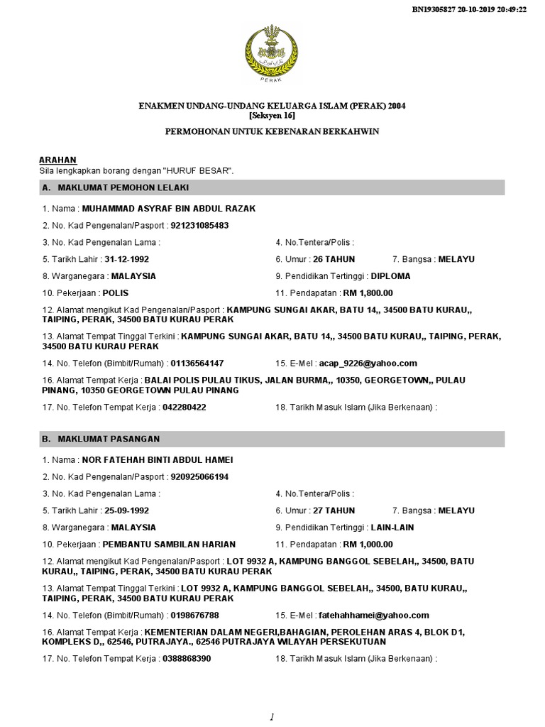 Borang 1 Enakmen Undang Undang Keluarga Islam Perak 2004 Seksyen 16 Kaedah Kaedah Undang Undang Keluarga Islam Borang Dan Fi 2013 Subkaedah 2 A Resume Personalized Items Person
