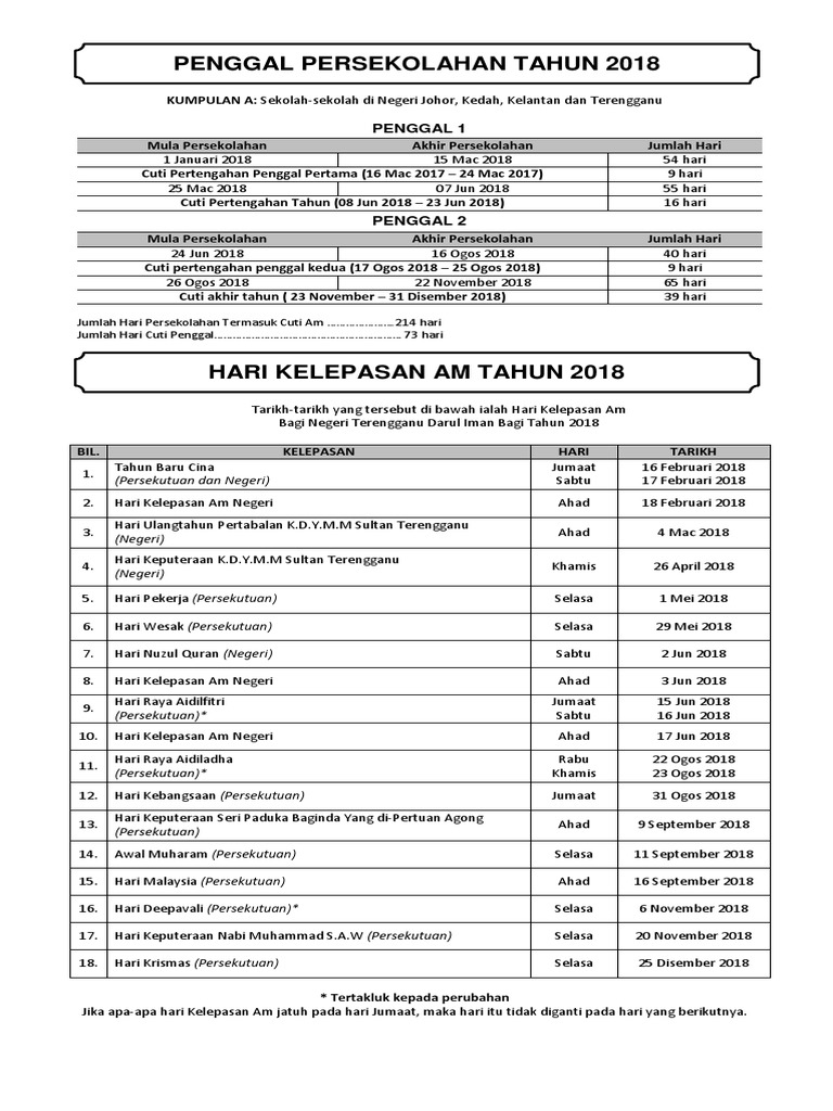 Penggal Persekolahan Dan Hari Kelepasan Am Tahun 2018