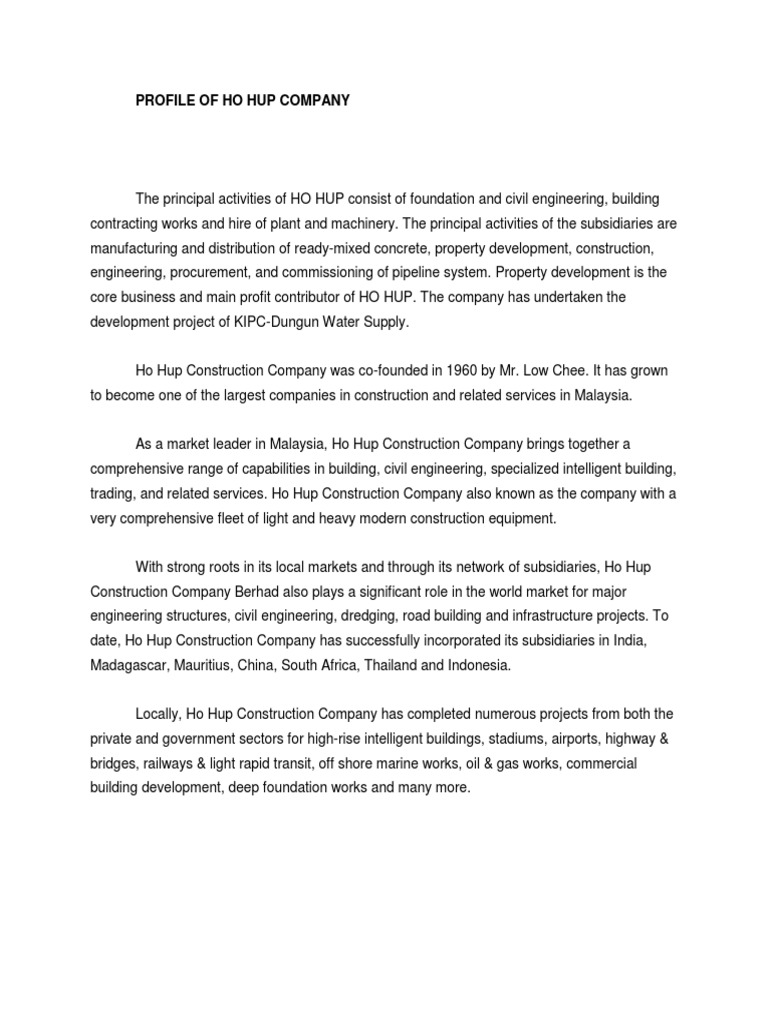 Profile Of Ho Hup Company Docx Swot Analysis Industries