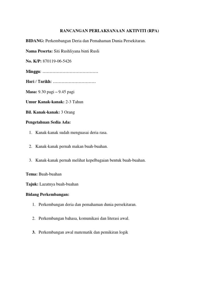 Rpa Ubi Docx Rancangan Pelaksanaan Aktiviti Rpa Kurikulum Permata Negara Tarikh Hari Masa Umur Bilangan Kanak Kanak Tema Tajuk Aktiviti Bidang Course Hero