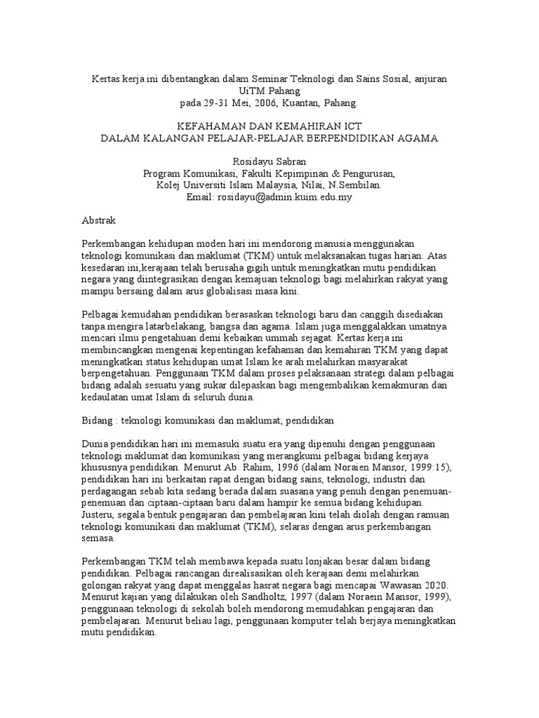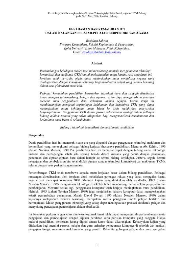 Kefahaman Dan Kemahiran Ict Dalam Kalangan Pelajar Pelajar Berpendidikan Agama